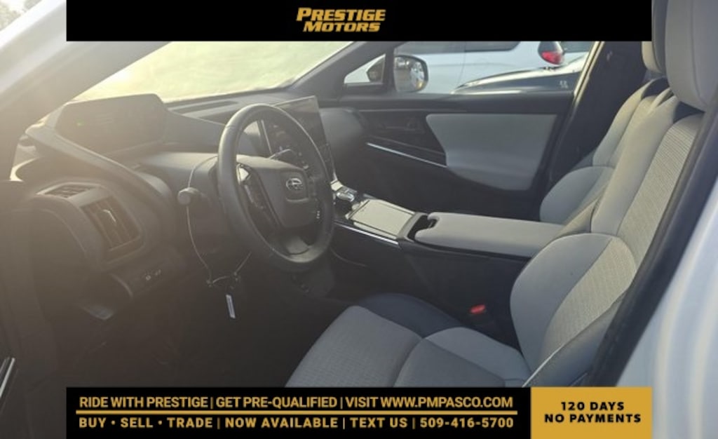 Solterra Limited, 4D Sport Utility, Electric Motor, AWD, Navigation system: Cloud Navigation System (Subscription required), 11 Speakers, 13.8 Axle Ratio, 4-Wheel Disc Brakes, ABS brakes, Air Conditioning, Alloy wheels, AM/FM radio: SiriusXM, Auto High-beam Headlights, Auto-dimming Rear-View mirror, Automatic temperature control, Brake assist, Bumpers: body-color, Cargo Cover, Driver door bin, Driver vanity mirror, Dual front impact airbags, Dual front side impact airbags, Electronic Stability Control, Emergency communication system: Subaru Solterra Connect - Safety Connect (1 year trial included), Four wheel independent suspension, Front anti-roll bar, Front Bucket Seats, Front Center Armrest, Front dual zone A/C, Front fog lights, Front reading lights, Fully automatic headlights, Garage door transmitter: HomeLink, harman/kardon® Speakers, Heated door mirrors, Heated Front Bucket Seats, Heated front seats, Heated rear seats, Heated steering wheel, Illuminated entry, Knee airbag, Leather steering wheel, Low tire pressure warning, Memory seat, Occupant sensing airbag, Outside temperature display, Overhead airbag, Overhead console, Panic alarm, Passenger door bin, Passenger vanity mirror, Power door mirrors, Power driver seat, Power Liftgate, Power steering, Power windows, Radio data system, Radio: Subaru Solterra Connect 12.3" Multimedia System, Rain sensing wipers, Rear anti-roll bar, Rear reading lights, Rear seat center armrest, Rear window defroster, Remote keyless entry, Security system, Speed control, Speed-sensing steering, Split folding rear seat, Spoiler, Standard Model, StarTex Upholstery, Steering wheel mounted audio controls, Telescoping steering wheel, Tilt steering wheel, Traction control, Trip computer, Turn signal indicator mirrors, Variably intermittent wipers, Wheels: 20" x 7.5" J Aluminum-Alloy Gray Finish, Solterra Limited, 4D Sport Utility, Electric Motor, AWD, Navigation system: Cloud Navigation System (Subscription required). CARFAX One-Owner. Recent Arrival!